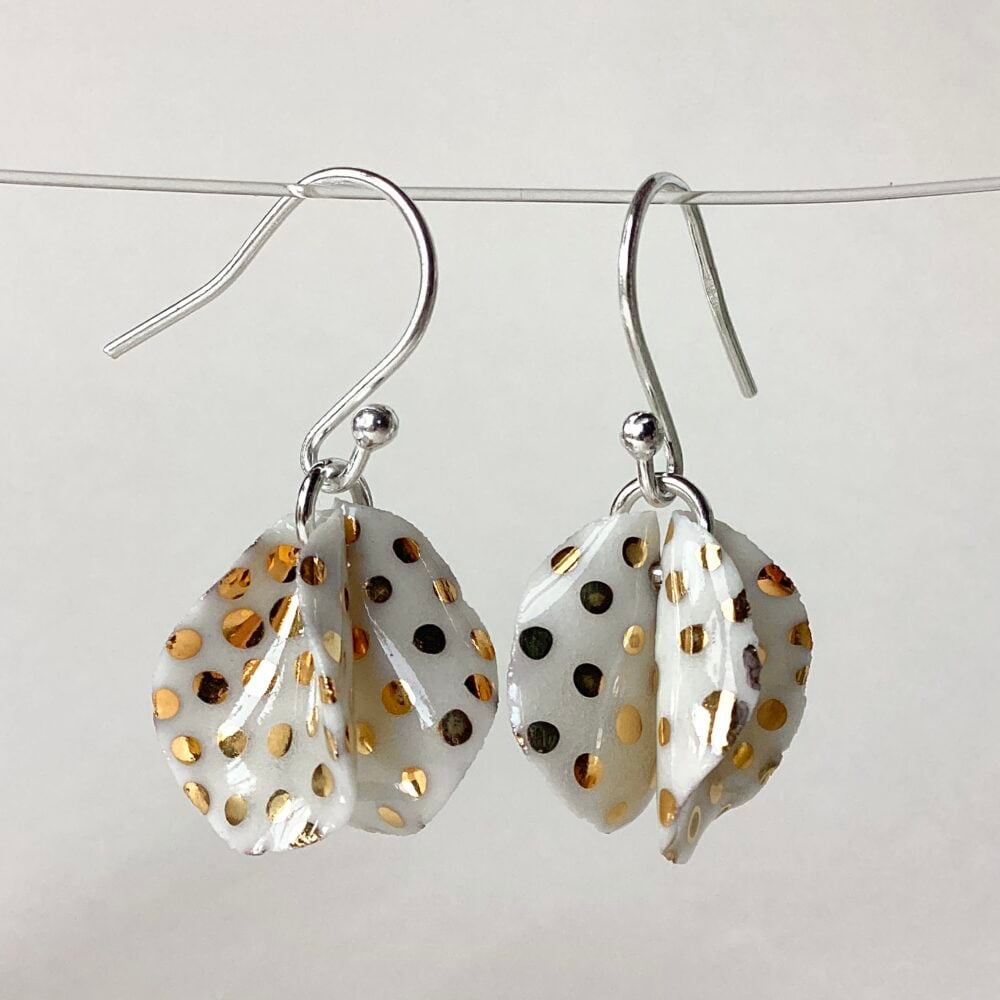 Jeweller Tracey graduated in 3-Dimensional Design at University where she majored in ceramics. Each petal within her Petal collection is hand formed out of porcelain clay. These are then fired and glazed, to have different matt and shiny textures. Each one is then decorated with a special ceramic ‘lustre’ glaze – the gold contains real gold and the silver coloured lustre contains real platinum! These are painted onto the petals to colour the petals or to form intricate patterns including lots of spots and stripes! Once the lustres have been fired onto the petals, the petals are then carefully linked together to form earrings and necklaces. Tiny freshwater pearls are used to embellish the pieces. All the fittings, earrings and chains are made from sterling silver.