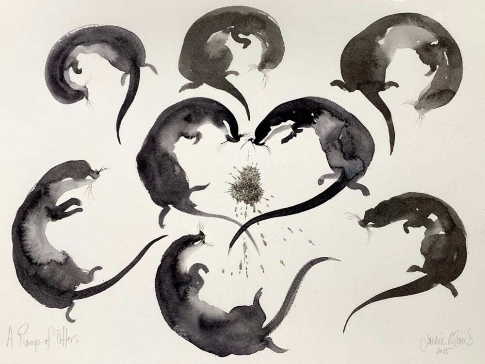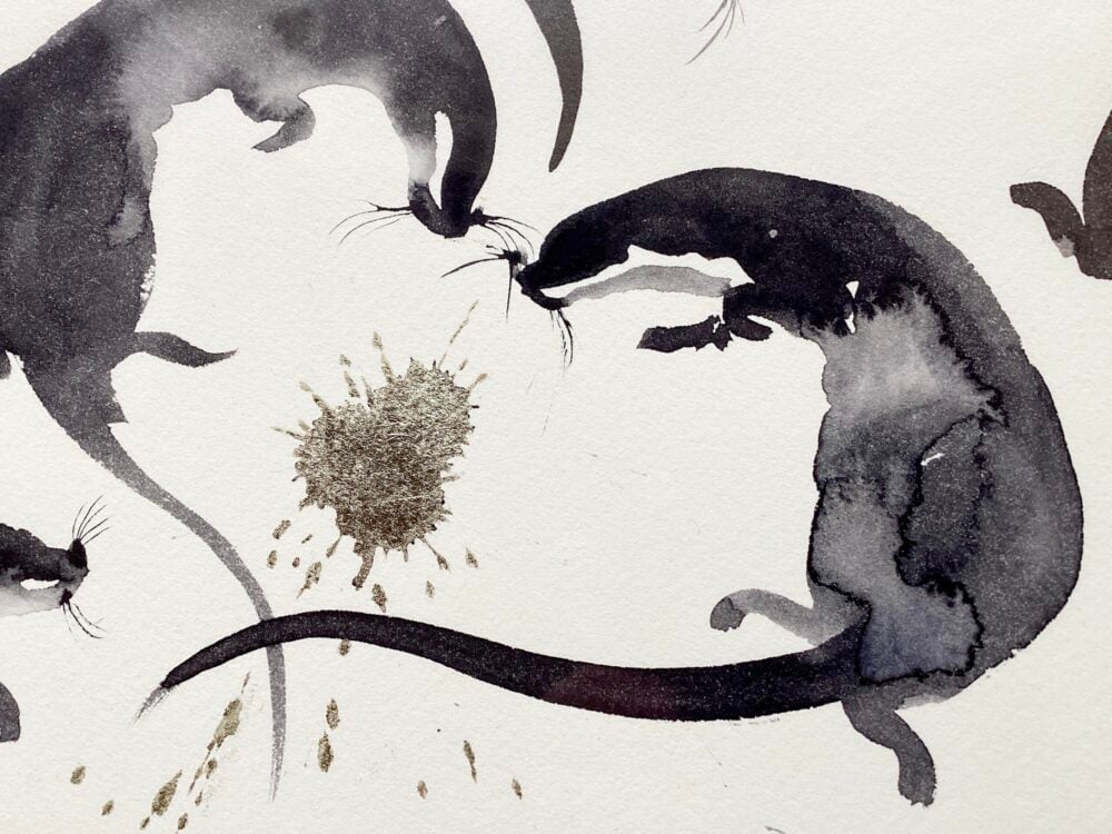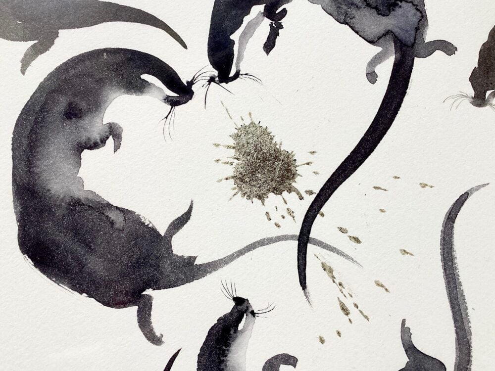 Painted in Sumi ink and white gold leaf on watercolour paper