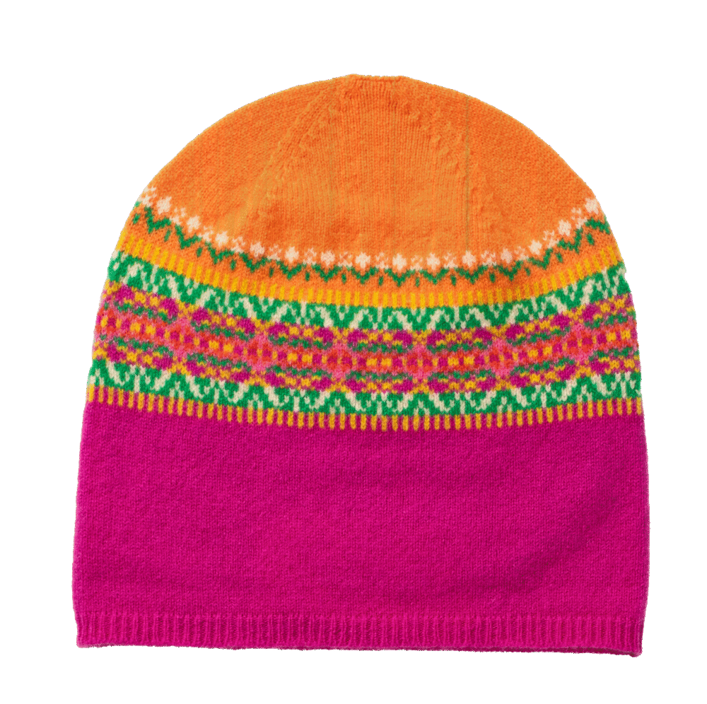 This cute and stylish Alloa Beanie in WOW colours features a beautifully colour blended Fairisle pattern and can be worn turned up or left long depending on your style preference. Designed to match other accessories in the Alloa group, the beanie is seamless for ultimate comfort. Knitted in Scotland in 100% Merino wool.