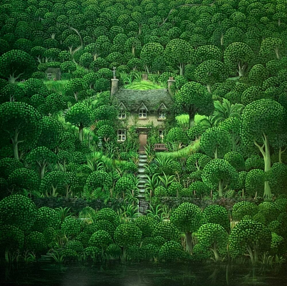 “This painting is based on a memory of a walk that I took one day in June when it was really hot. It was really lovely and cool in the woods alongside the River Wye, too hot to be out in the bright sunlight. I saw a house set above the river in the most lovely garden, it was so secluded and quiet, it was like it was in its own little world. It was a lovely surprise. It has stuck in my memory!”