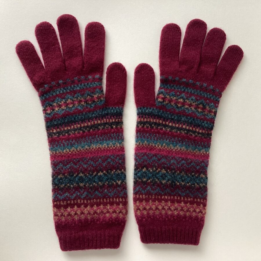 These warm and cosy Alpine gloves are extra long to keep hands and wrists warm, knitted in an intricate Fairisle design in Scotland in 100% Merino wool. These stylish gloves are the perfect combination of warm and practical!