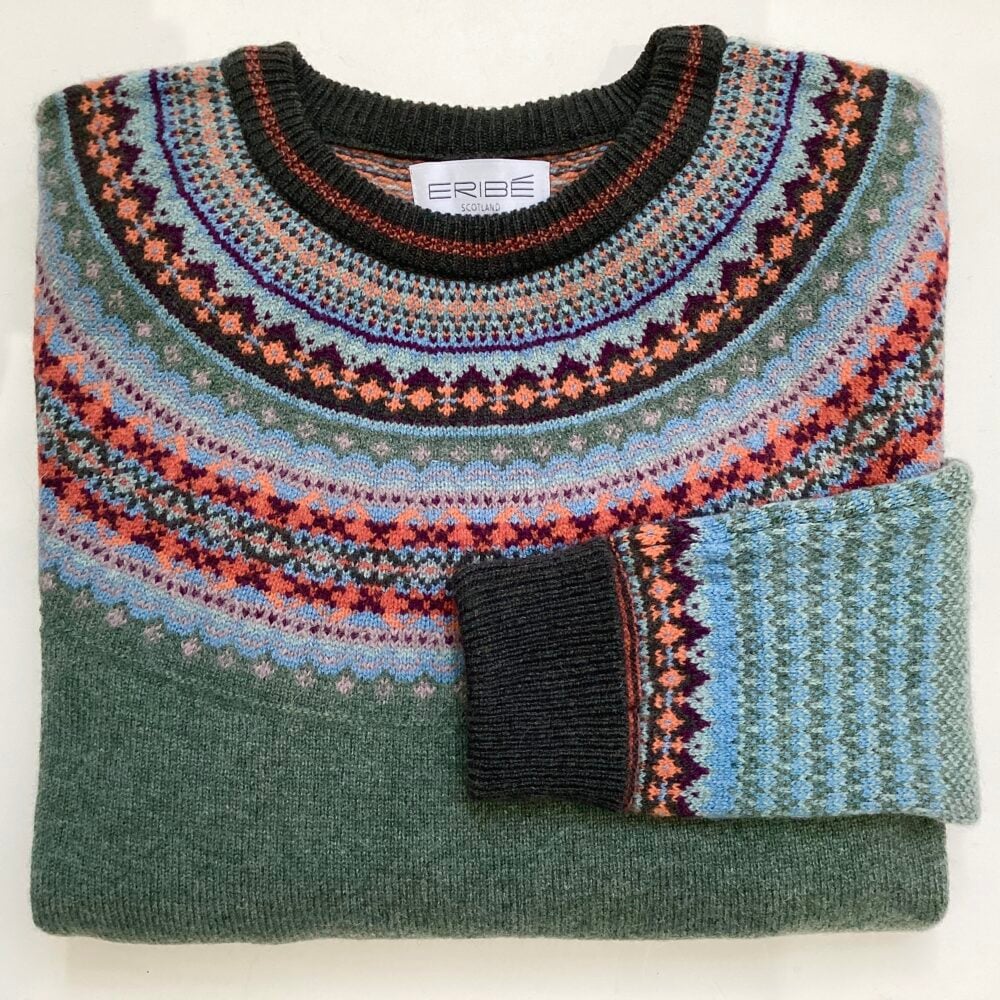 This Merino wool sweater features an intricately patterned, eight-colour Fairisle yoke with accents of luxe silky soft angora for texture and cosy long turn-down cuffs.