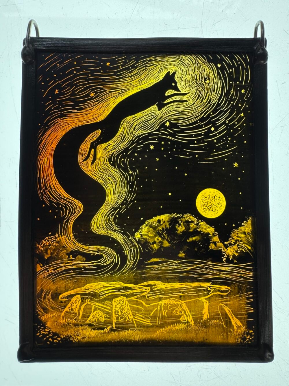 Tamsin’s work is influenced by the Herefordshire countryside, the orchards, the hills, the woods and all the plants, birds and animals that grow and live. She works on mainly British made mouth blown glass, in fabulous colours. She completely covers the glass with a special black glass paint which is totally opaque. When the paint is dry Tamsin then scrapes back into it using a variety of simple tools. She uses the paint like a scraper board which is working in the negative to achieve an effect rather like a woodcut.