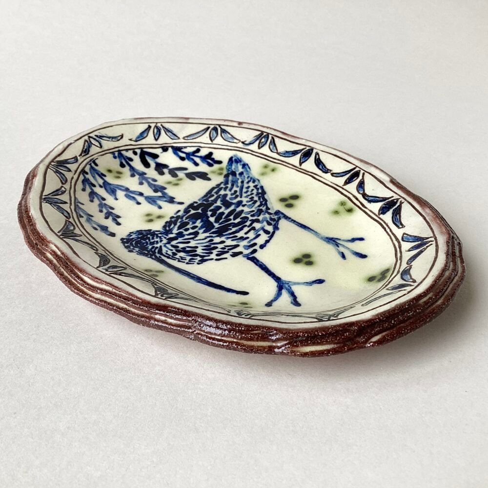 Karen has worked with clay full time since 2009. Clay, especially red earthenware is her passion, making a modern version of traditional slipware. Each piece is individually made, usually hand built. Creamy slip (liquid clay) is brushed or poured on and the drawing is made directly on the slip revealing the red clay body- sgraffito. Using a limited palette of mainly raw iron, cobalt and copper oxide to add colour and depth to the work.
