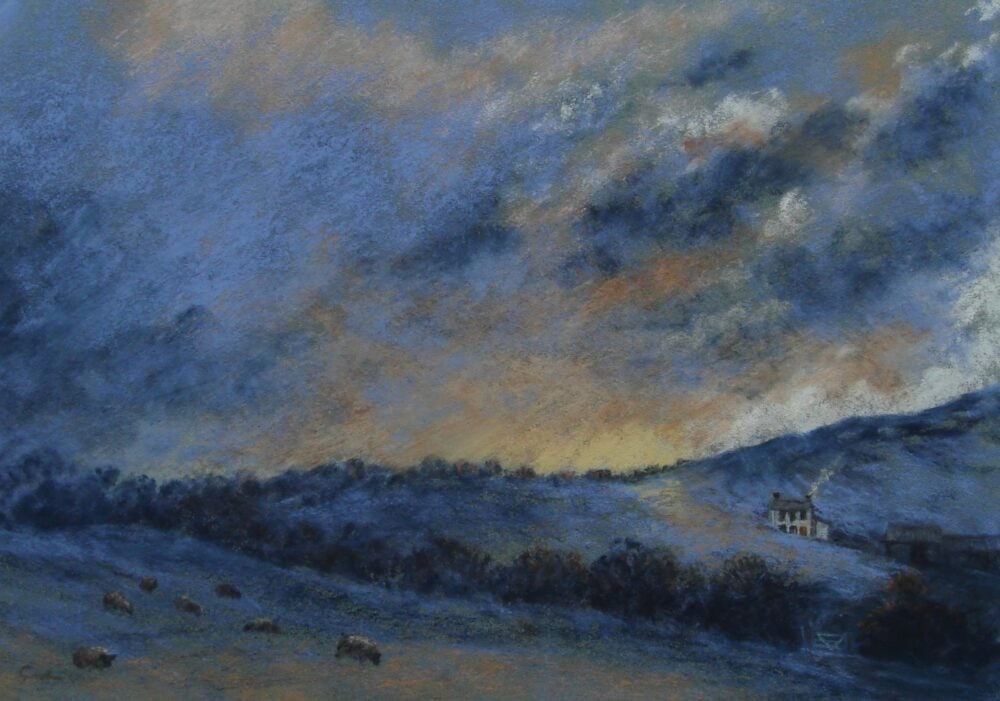 Artist Joanna Griffiths’s new oil paintings depict her most loved subject of the hills, farms and moorland which surround her home in the Welsh Marches. They show her fascination for details which make up a landscape: tall grasses bent and battered by Winter; tiny yellow flowers opening on resilient gorse; and farmland bursting into life with lush new grass and thriving lambs. Snow features too, “Spring comes late in upland areas but gradually the bright, sharp sunlight breaks through the remaining snow and driving rain to reveal a glistening world brimming with life”.