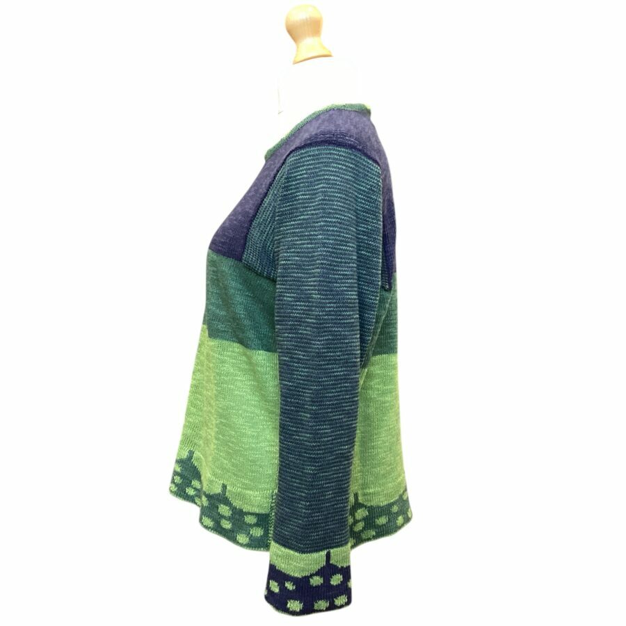 A simple pullover with a box sleeve, the pattern around the hem is a lovely attention grabber and makes this a versatile garment which is ideal with trousers, denims and skirts.