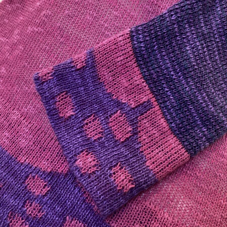 A simple pullover with a box sleeve, the pattern around the hem is a lovely attention grabber and makes this a versatile garment which is ideal with trousers, denims and skirts.