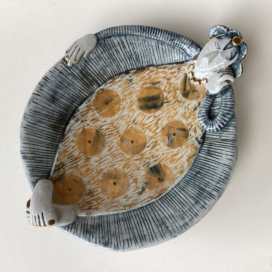 Helen describes her pots as ‘serious, posh and frivolous’ because for many years she was a functional potter, making batches of domestic pots on the wheel. These recent sculptures are hand built individually and each is considered separately. This change in direction followed the death of her youngest child, Tom, at 15 in a steamboat accident.
