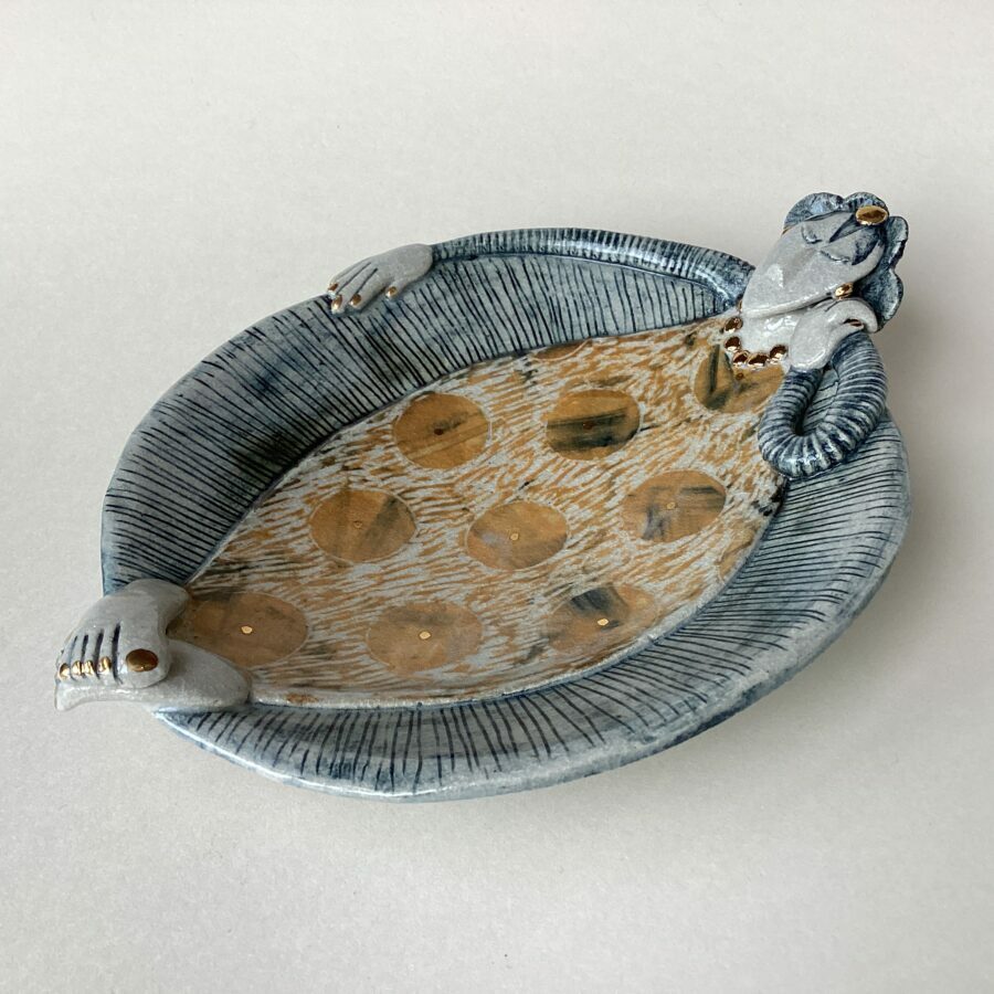 Her work completely changed, and she started to use a hand building technique using soft and flexible sheets of clay. The sheets of clay are freely cut, curved and sometimes twisted. She plays with perspective by distorting the objects as in a stage set. By inclination she is also a painter, and views these flattened forms as three dimensional canvases. The surfaces are painted with slips, underglaze pigments, and resists. Sometimes she adds silver and gold lustres.