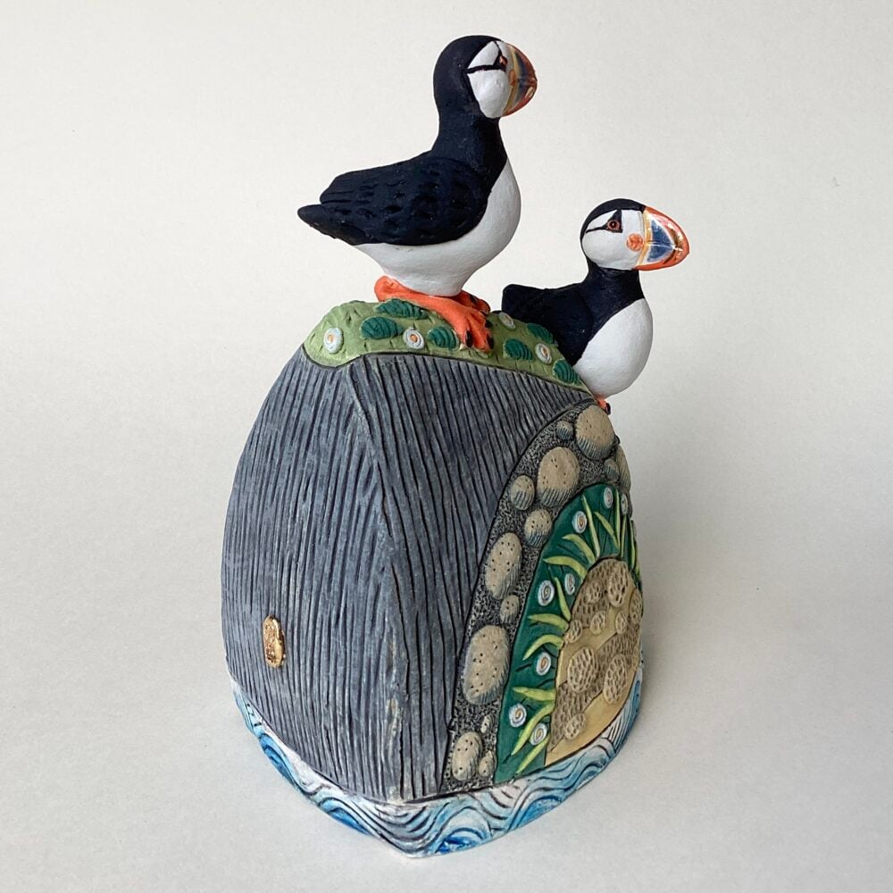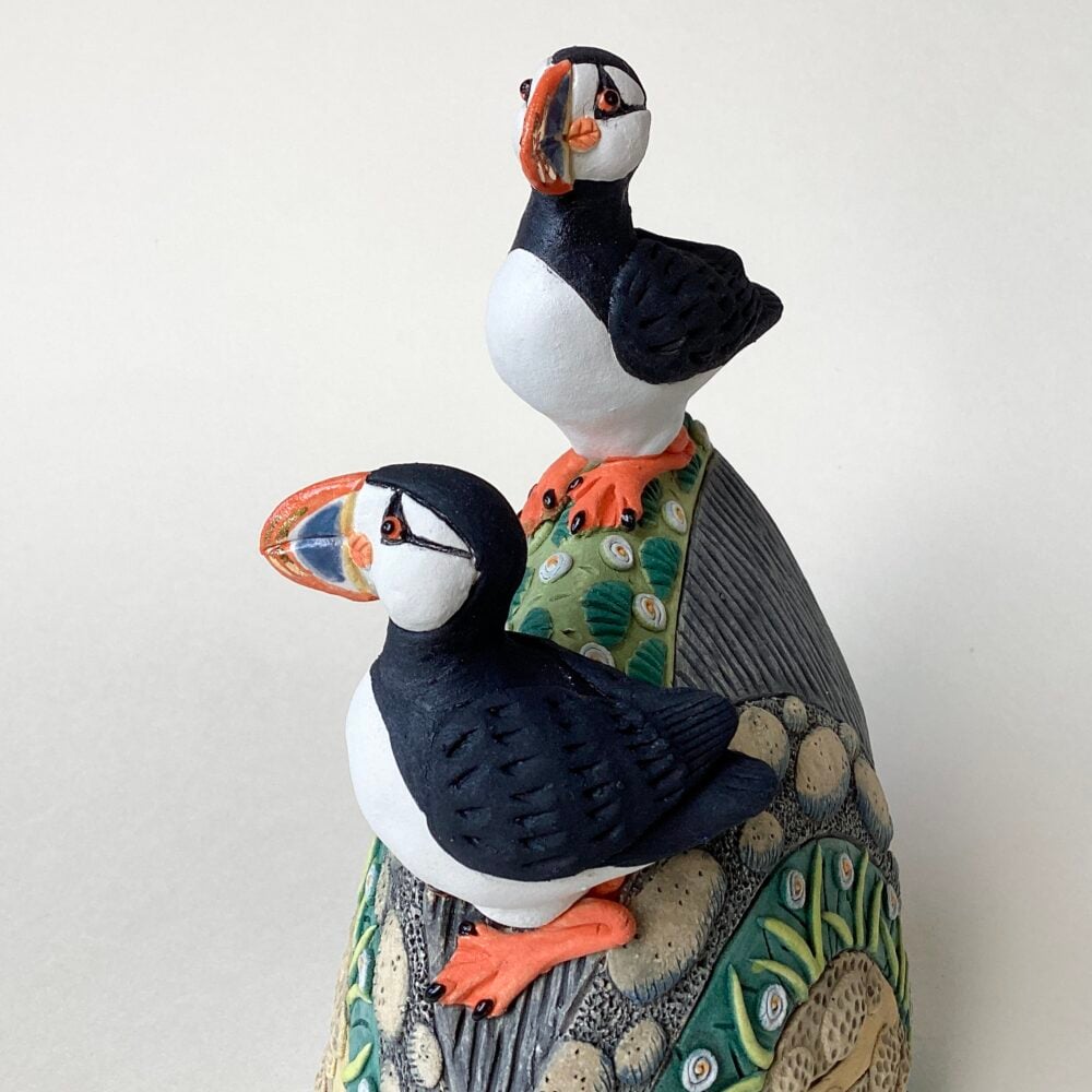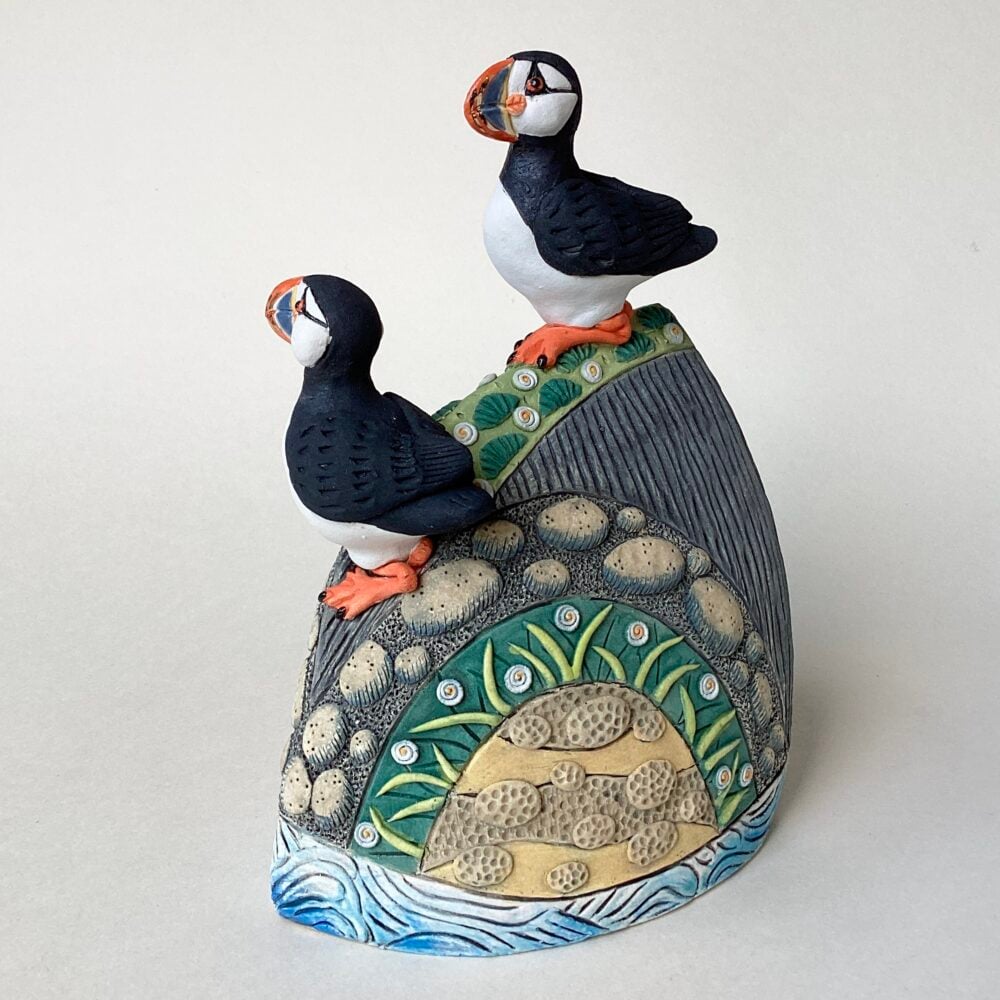 A hand sculpted stoneware landscape with puffins on a cliff face. Finished with oxides, underglaze, glaze and gold lustre.