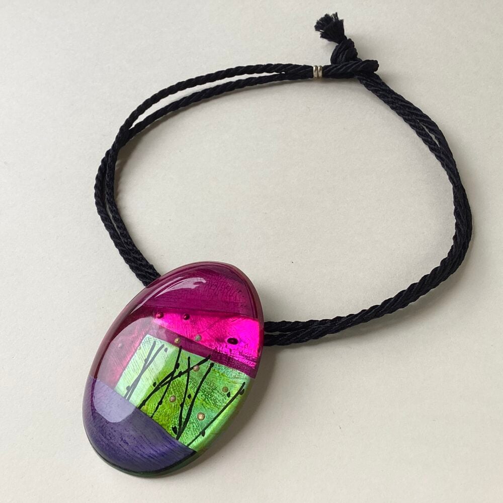 ‘Grapevine’ Large Oval Pendant one thick black cord in lime, pink and purple