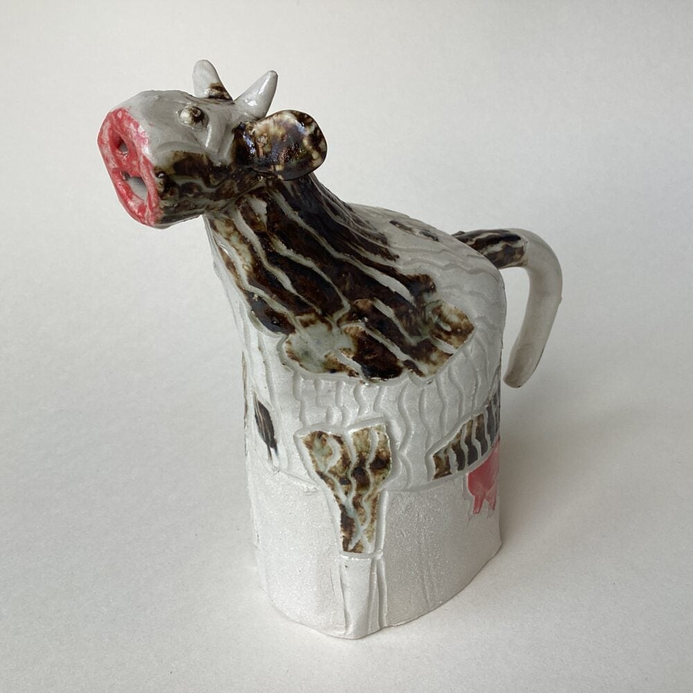 But the fish have a more frivolous aspect, the glug-glug vases of the Victorians who also made cow-creamers, Toby jugs, and Staffordshire dogs. All of which I like to make in my own way. Unlike the cute Staffordshire dogs, mine often have claws that clatter on wooden floors, teeth that might bite, and sometimes slobbering tongues for too many wet kisses. I always nearly always start with a thrown vessel, without a plan. Then I cut and add pieces of clay. I often laugh – so this is what you were meant to be! Then, depending on the clay used, and the final expected firing temperature, I add pattern and colour in the form of oxides. And then for the final firing I add glaze, while thinking, ‘Is this the blue bird of happiness, the red bird of compassion or the green phoenix of regeneration?’ and fire again.