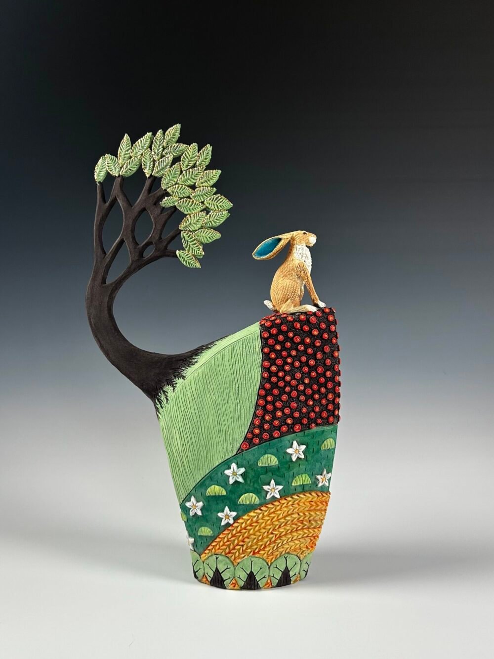 A hand sculpted stoneware Landscape with tree and Hare. Finished with oxides, underglaze, glaze and gold lustre.