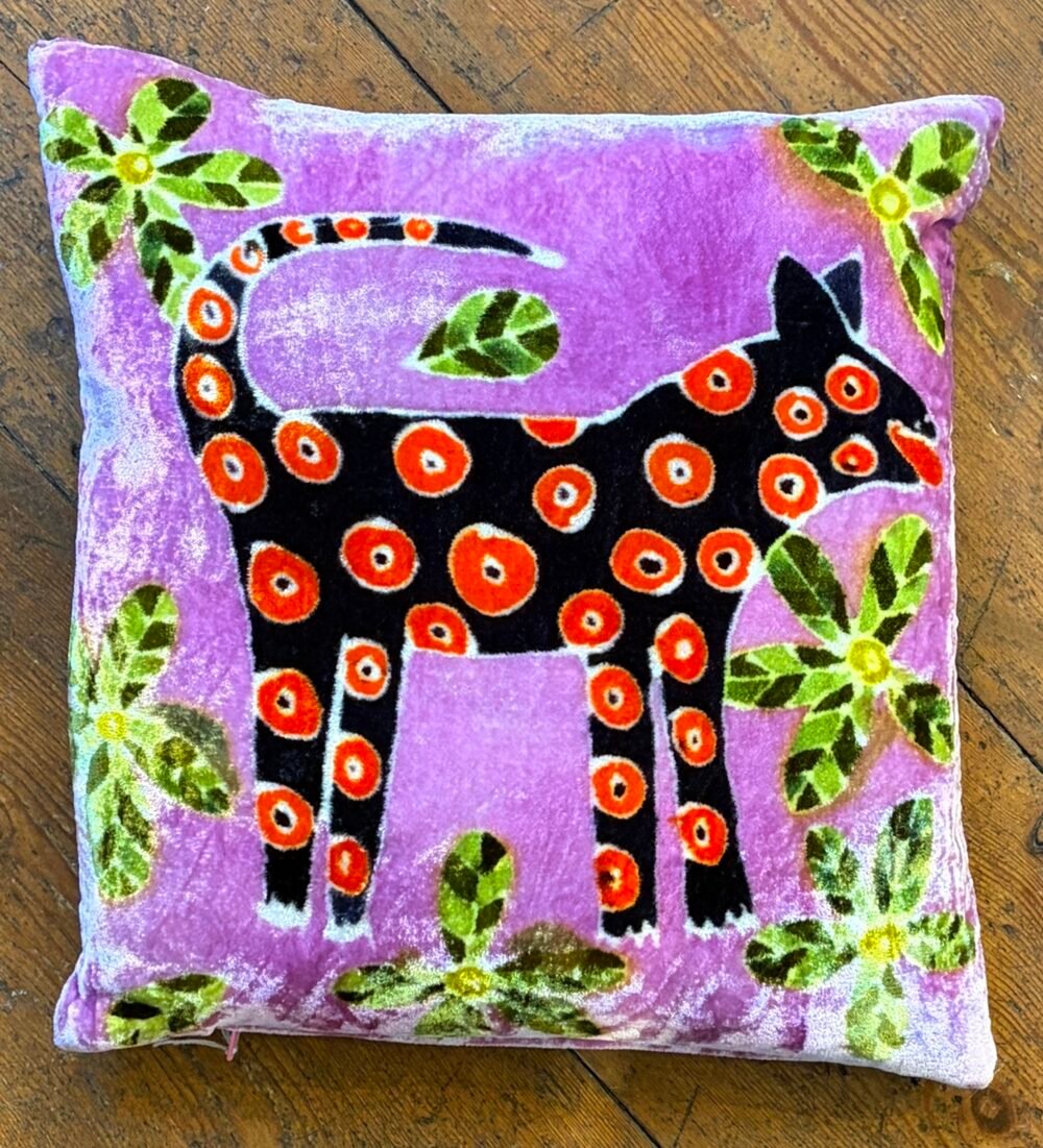 These cushions are hand painted so that one-off designs can be created economically without the constraints of setting up a print run. The artist’s strength lies in their ability to draw and choose colours. They enjoy the variations that occur during hand painting, which gives each piece a uniqueness and makes each piece individual and that enhances it’s charm.
