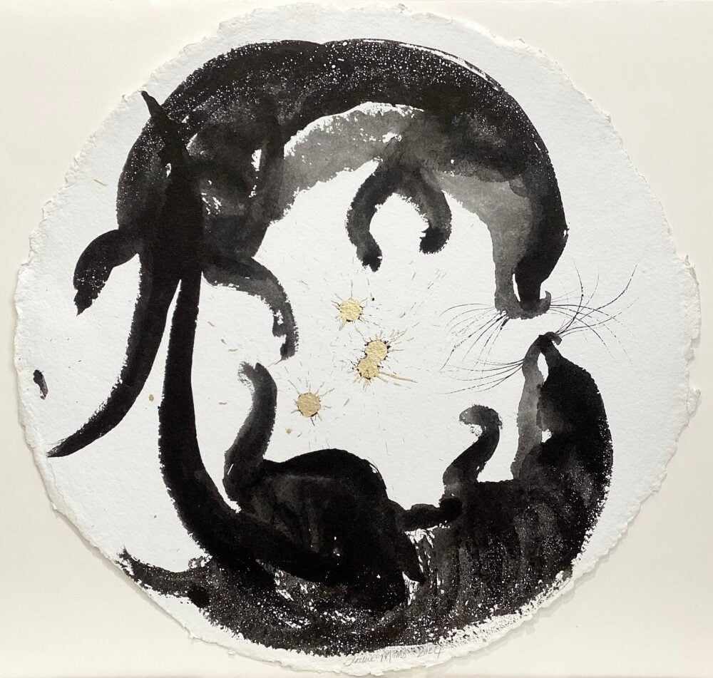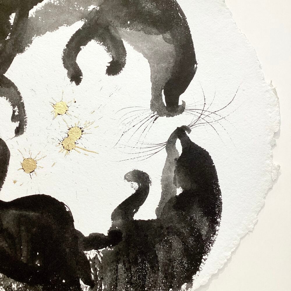 Painted in Sumi inks on a circular sheet of Two Rivers hand made watercolour paper, raw deckle edges, heavy weight, with large gold leaf splash at centre.