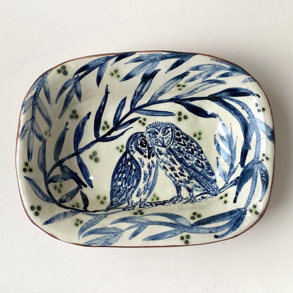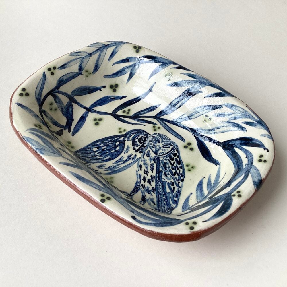 Karen has worked with clay full time since 2009. Clay, especially red earthenware is her passion, making a modern version of traditional slipware. Each piece is individually made, usually hand built. Creamy slip (liquid clay) is brushed or poured on and the drawing is made directly on the slip revealing the red clay body- sgraffito. Using a limited palette of mainly raw iron, cobalt and copper oxide to add colour and depth to the work.