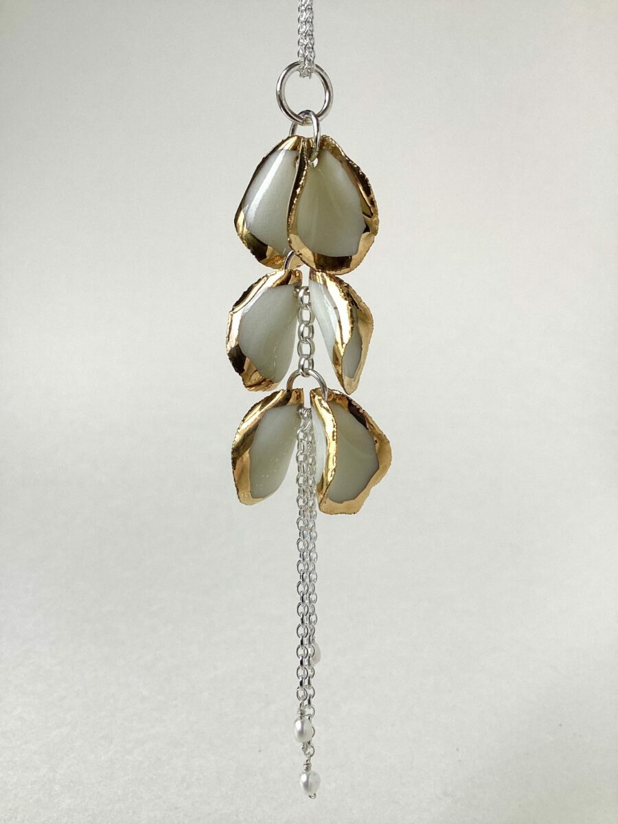Jeweller Tracey graduated in 3-Dimensional Design at University where she majored in ceramics. Each petal within her Petal collection is hand formed out of porcelain clay. These are then fired and glazed, to have different matt and shiny textures. Each one is then decorated with a special ceramic ‘lustre’ glaze – the gold contains real gold and the silver coloured lustre contains real platinum! These are painted onto the petals to colour the petals or to form intricate patterns including lots of spots and stripes! Once the lustres have been fired onto the petals, the petals are then carefully linked together to form earrings and necklaces. Tiny freshwater pearls are used to embellish the pieces. All the fittings, earrings and chains are made from sterling silver.