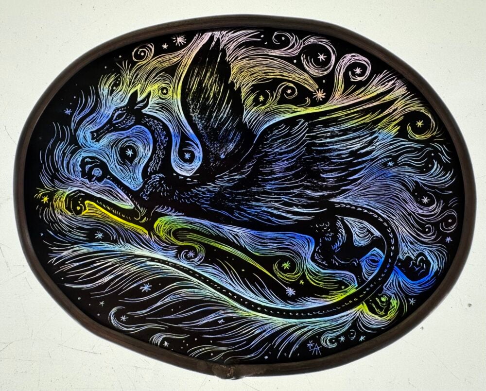 In 1999 I began an evening class in stained glass at Hereford College of Art and Design. I soon gained an OCN in the craft but continued the course for a total of four years until our second child started school. At this point I decided to take things more seriously and invested some money in a kiln and built a studio in which to work.”