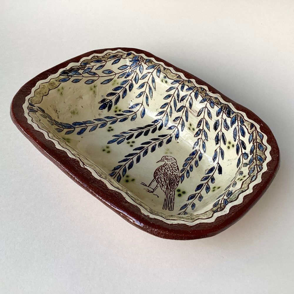 Karen has worked with clay full time since 2009. Clay, especially red earthenware is her passion, making a modern version of traditional slipware. Each piece is individually made, usually hand built. Creamy slip (liquid clay) is brushed or poured on and the drawing is made directly on the slip revealing the red clay body- sgraffito. Using a limited palette of mainly raw iron, cobalt and copper oxide to add colour and depth to the work.