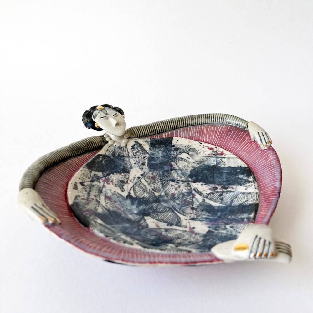 Her work completely changed, and she started to use a hand building technique using soft and flexible sheets of clay. The sheets of clay are freely cut, curved and sometimes twisted. She plays with perspective by distorting the objects as in a stage set. By inclination she is also a painter, and views these flattened forms as three dimensional canvases. The surfaces are painted with slips, underglaze pigments, and resists. Sometimes she adds silver and gold lustres.