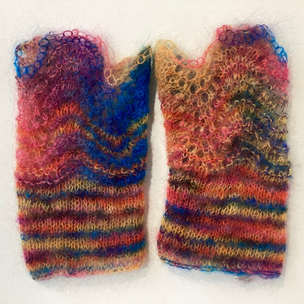 Hand knitted wrist warmers in fiery orange and peacock blue with very pretty scalloped edge