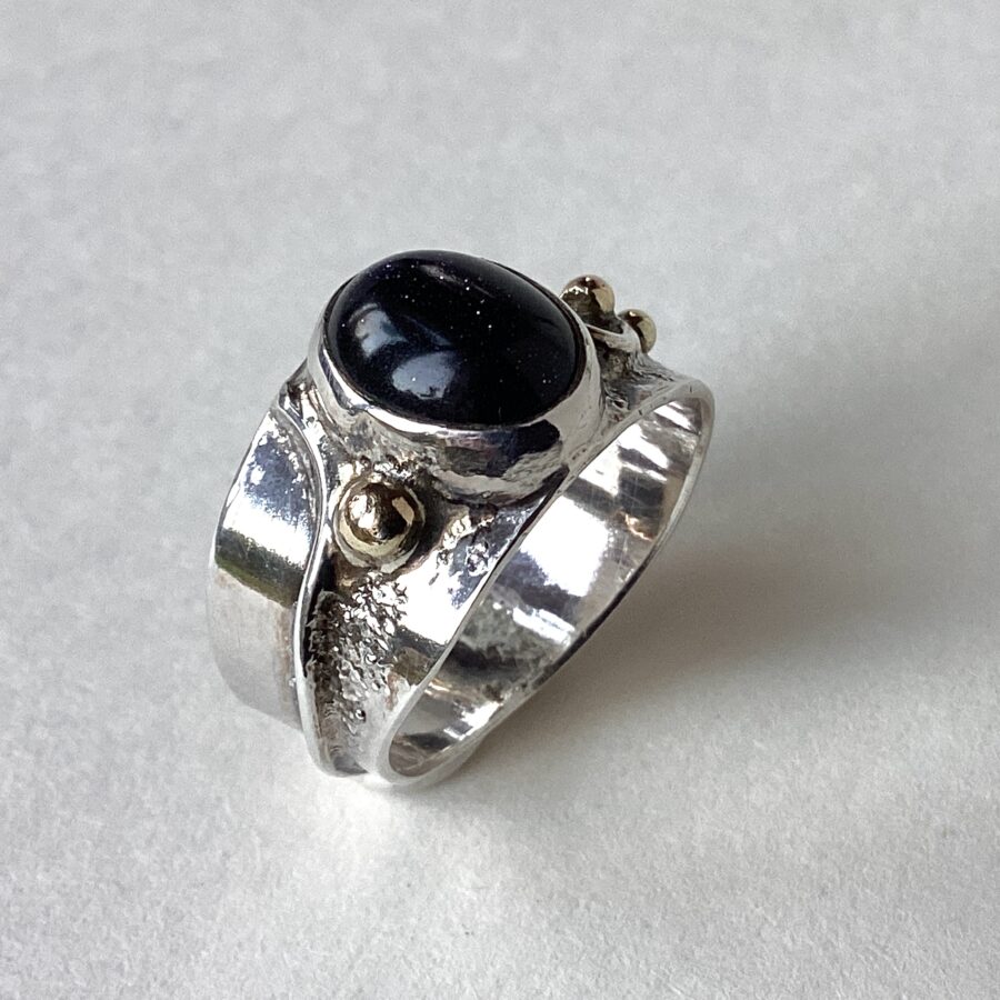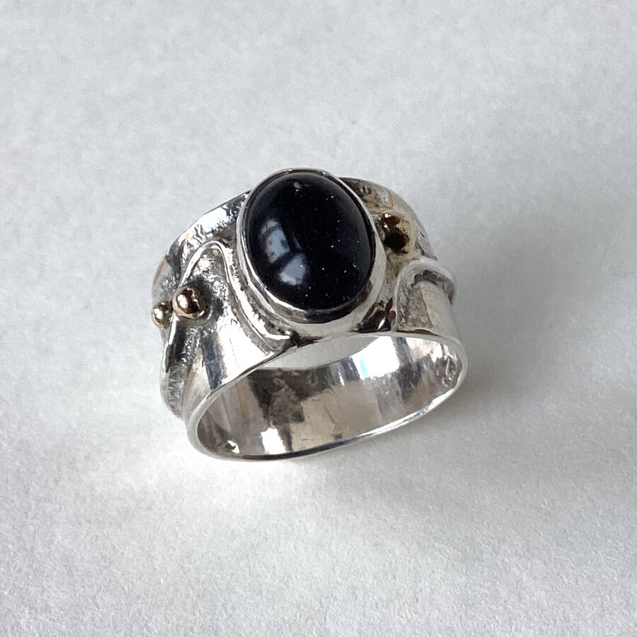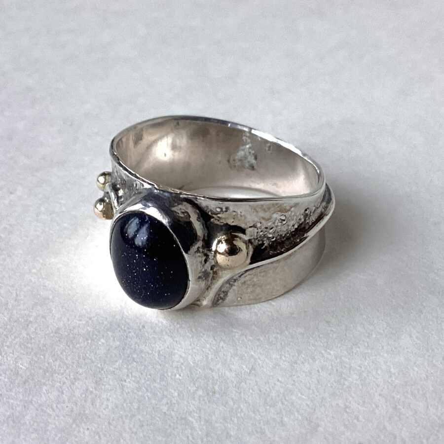 Beautiful sparkly silver ring with Aventurine stone and gold blobs.