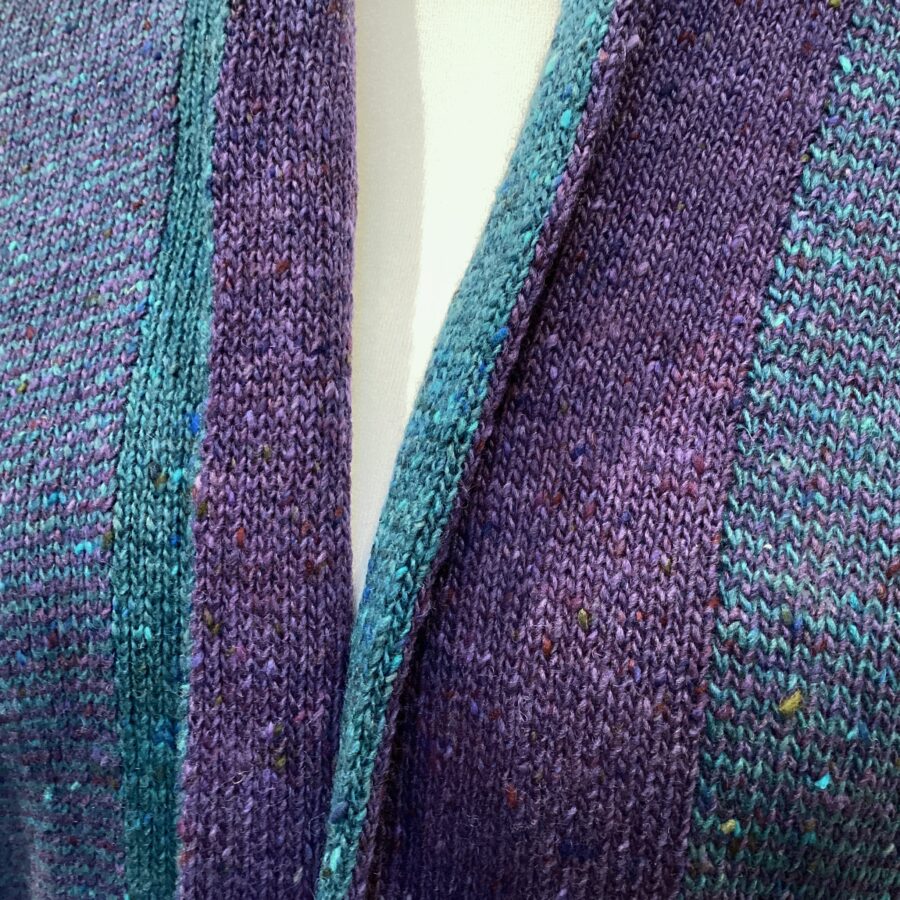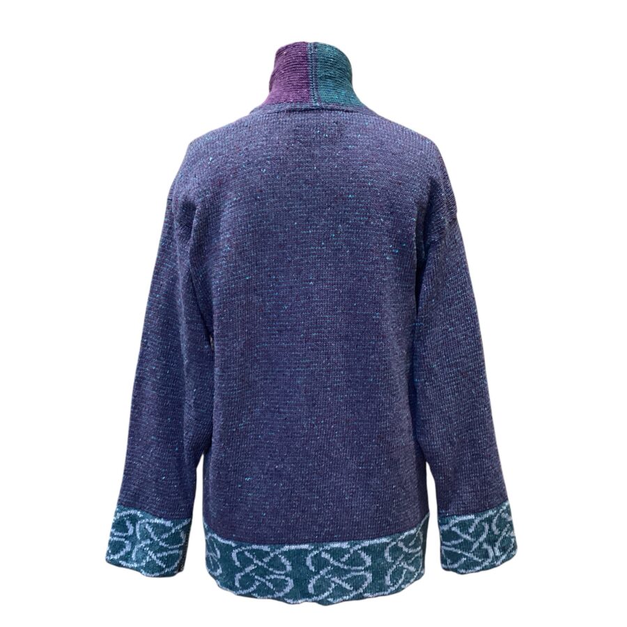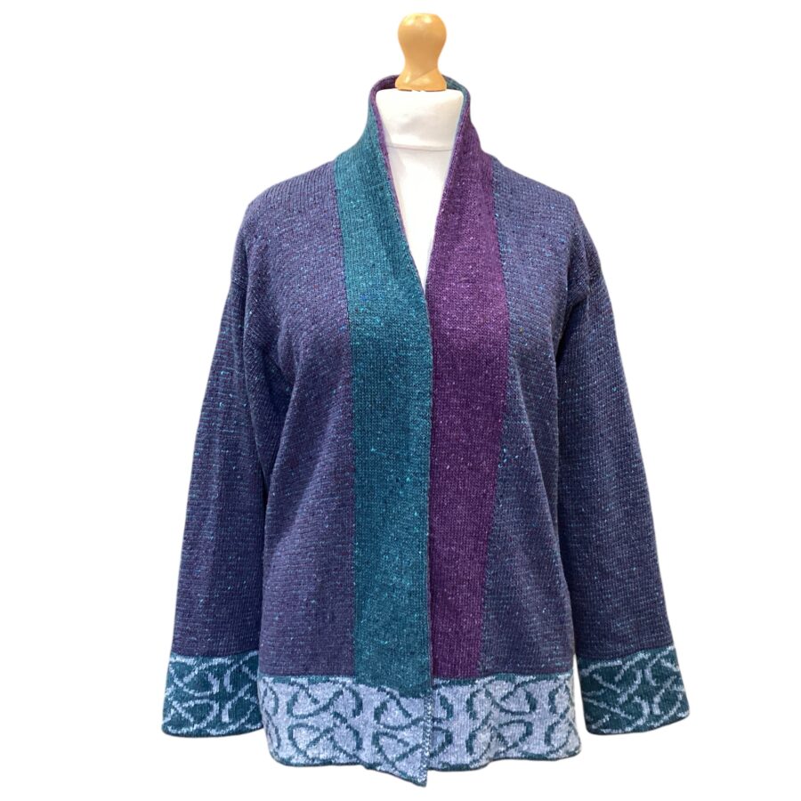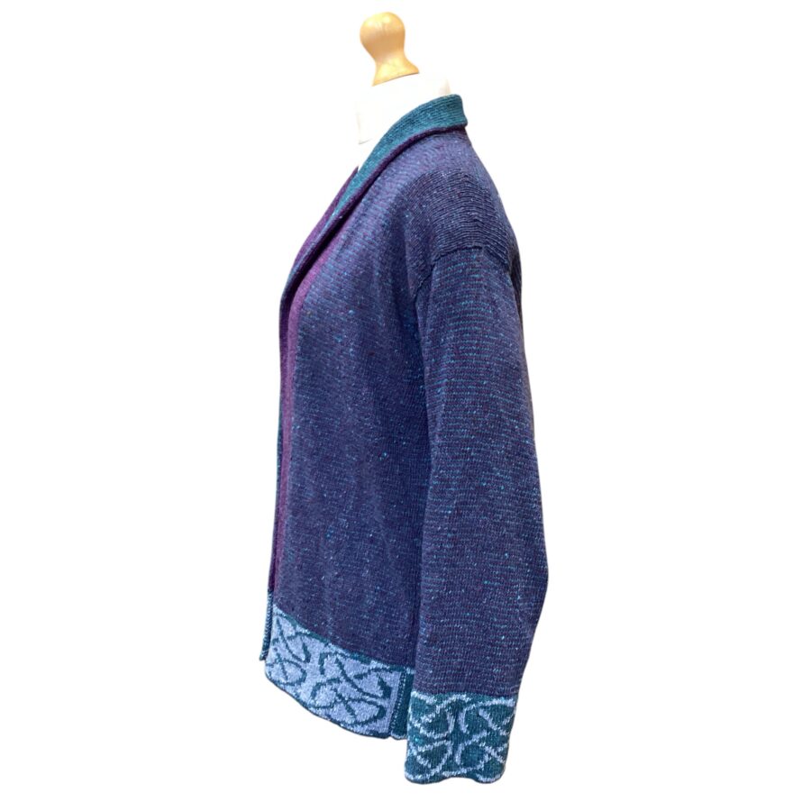The yarn comes in from Ireland and colourways are blended in Edinburgh giving the Skye Jacket a truly Celtic heart. Easy to wear, this is a loose fitting style with reversible cuffs which allow you to fold back and shorten the sleeves. There are no buttons or fastening so simply wear it open or if you should like, you can pair with a brooch to fasten the jacket.
