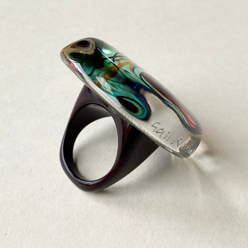 Gail trained at Manchester and Royal College of Art. Her handpainted acrylic refracts dense colour with metallic gold and silver undertones across smooth and sculpted surfaces. These interact with the organic curvature and geometry of the highly polished optical-quality acrylic shapes creating shimmering, ever changing iridescence.