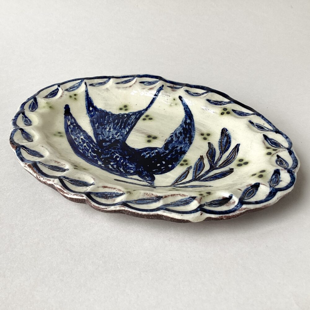 Karen has worked with clay full time since 2009. Clay, especially red earthenware is her passion, making a modern version of traditional slipware. Each piece is individually made, usually hand built. Creamy slip (liquid clay) is brushed or poured on and the drawing is made directly on the slip revealing the red clay body- sgraffito. Using a limited palette of mainly raw iron, cobalt and copper oxide to add colour and depth to the work.