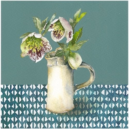 A favourite little jug holds a stem of the hellebore ‘Spotted Ladies’.