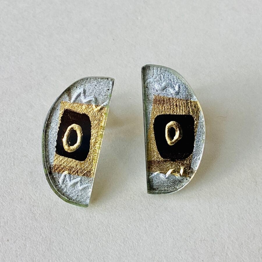 ‘I create hand painted acrylic jewellery which refracts dense colour with metallic gold and silver undertones across smooth and sculpted surfaces.These interact with the organic curvature and geometry of the highly polished optical-quality acrylic shapes, creating shimmering, ever changing iridescence.’